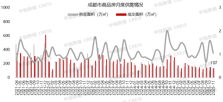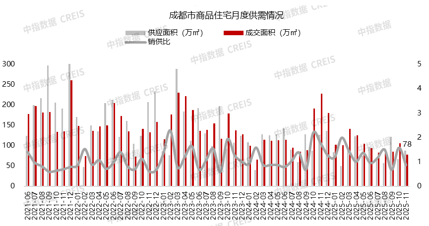 2025年11月,成都新建商品房供应约128.5万㎡,成交约136.9万㎡;商品住宅供应约88.0万㎡,成交约78.3万㎡。TOP30房地产企业1-11月累计实现在蓉销售金额约1593.9亿元,成交面积约768.5万㎡。