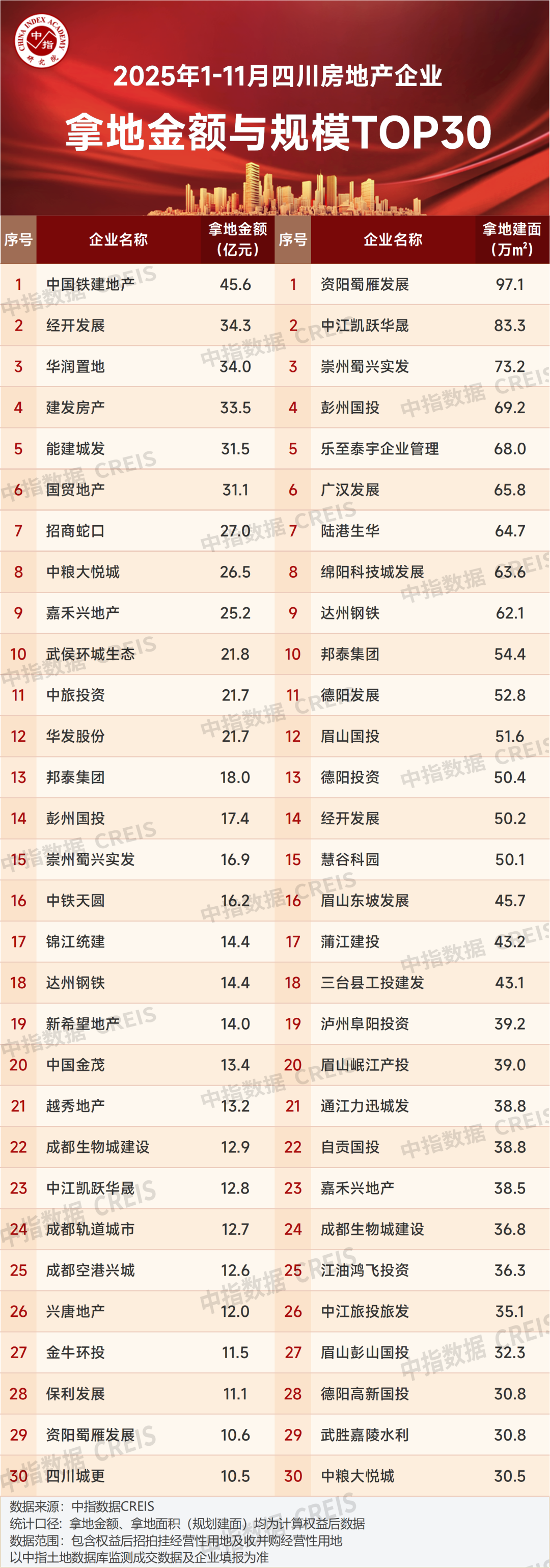 数据说明:房地产企业销售数据统计是以2025年1月1日-11月30日期间销售的商品房为统计口径,主要依据在四川的销售监测数据,并参考当期总体经营情况和推盘去化情况进行分析统计;对于少数没有在监测范围内的项目,由企业提供相关证明文件,经课题组对数据进行严格审核,也纳入统计范围。本报告仅供参考,课题组不对使用报告及其内容所引发的任何直接或间接损失承担责任。