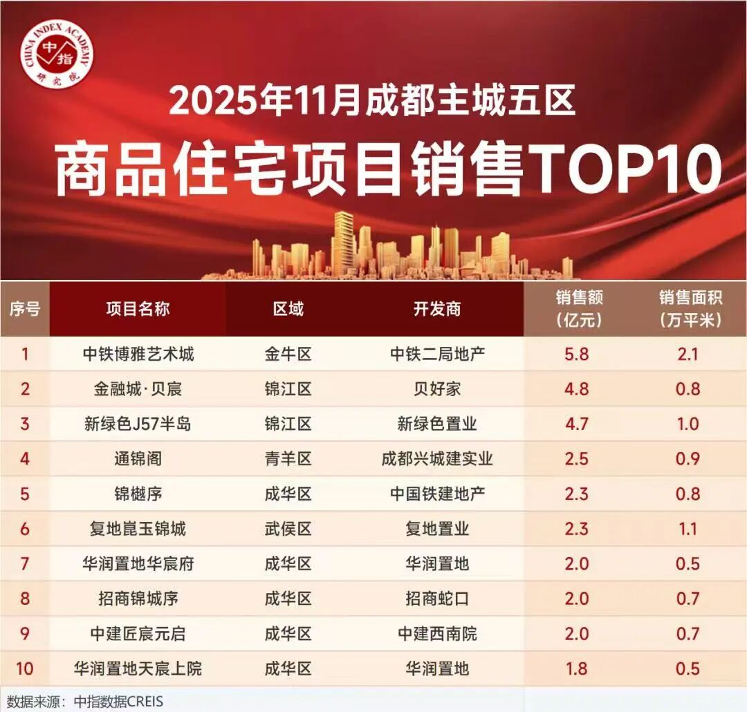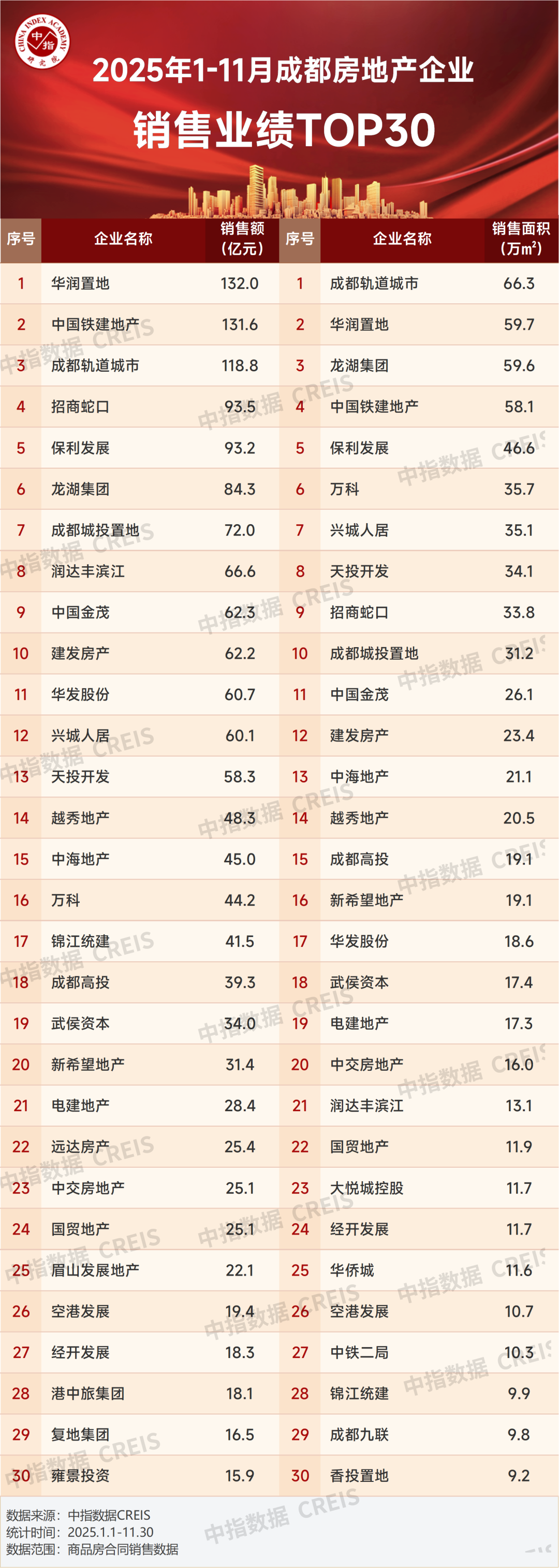 数据说明:房地产企业销售数据统计是以2025年1月1日-11月30日期间销售的商品房为统计口径,主要依据在成都的销售监测数据,并参考当期总体经营情况和推盘去化情况进行分析统计;对于少数没有在监测范围内的项目,由企业提供相关证明文件,经课题组对数据进行严格审核,也纳入统计范围。本报告仅供参考,课题组不对使用报告及其内容所引发的任何直接或间接损失承担责任。