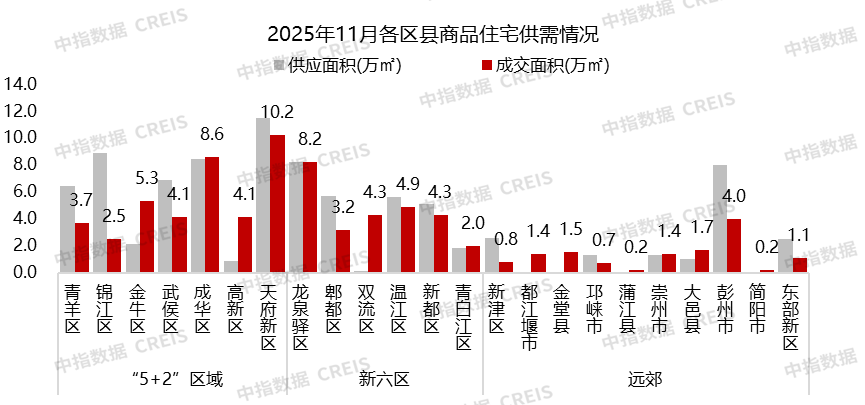 11月,天府新区商品住宅供应面积为11.5万㎡,为成都市最高;其次为锦江区的8.9万㎡。11月,天府新区商品住宅成交面积为10.2万㎡,为成都市最高;其次为成华区的8.6万㎡。