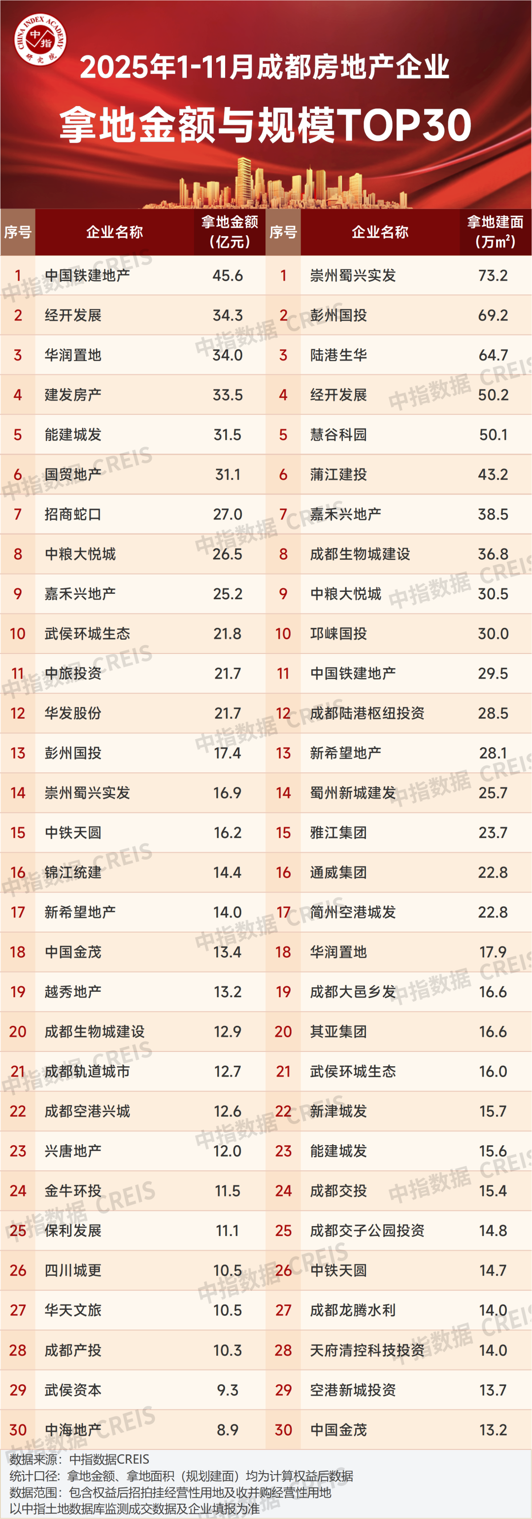 中国铁建地产以45.6亿元位列在蓉及在川拿地金额TOP1;崇州蜀兴实发以73.2万㎡位列在蓉拿地规模TOP1。