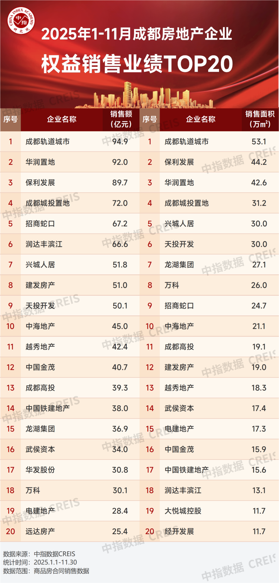 成都市2025年1-11月房地产权益销售业绩TOP20中,成都轨道城市以94.9亿元位列TOP1,此外,华润置地、保利发展、成都城投置地、招商蛇口、润达丰滨江、兴城人居、建发房产、天投开发、中海地产、越秀地产和中国金茂11家企业权益销售金额超40亿。